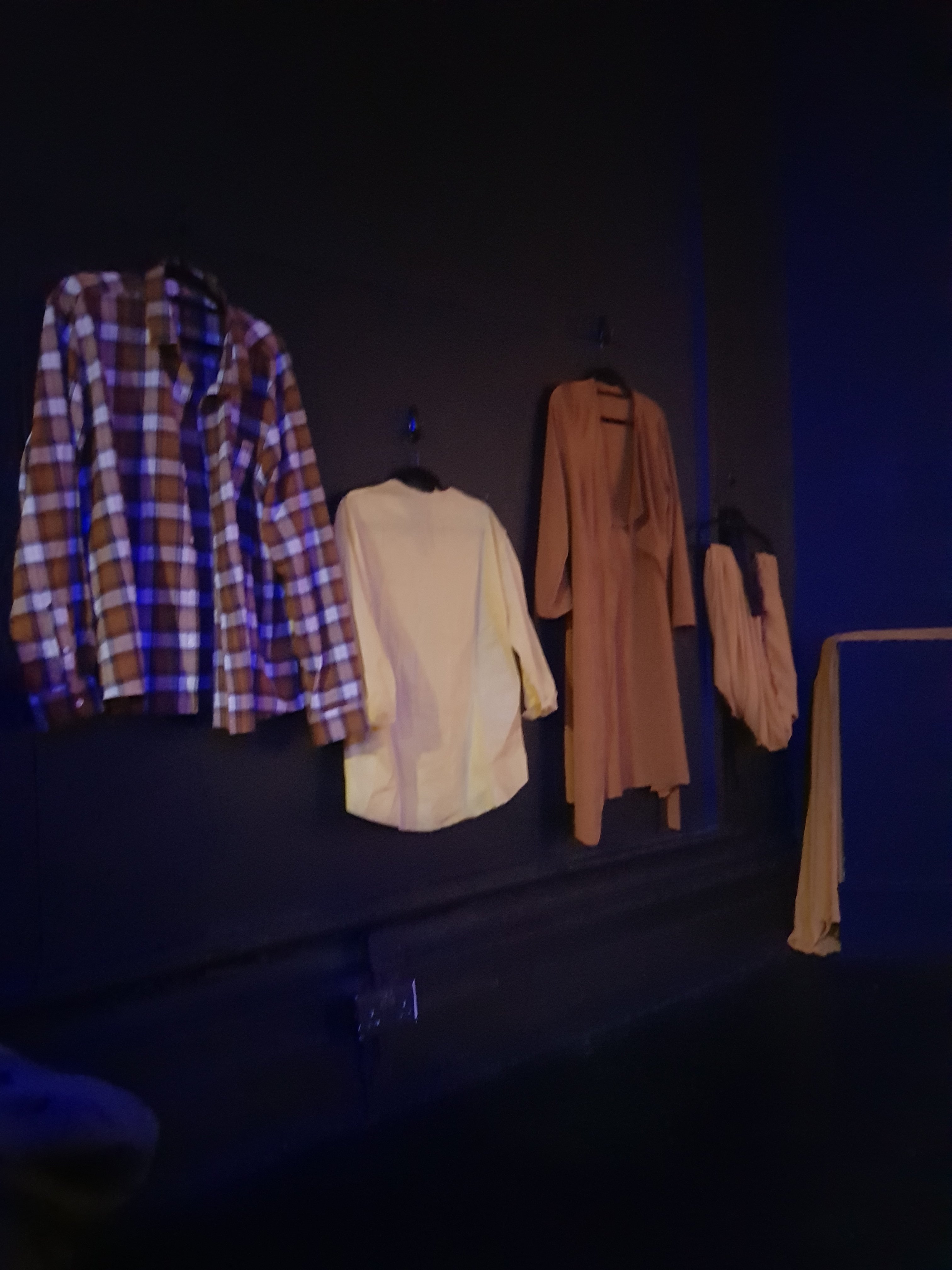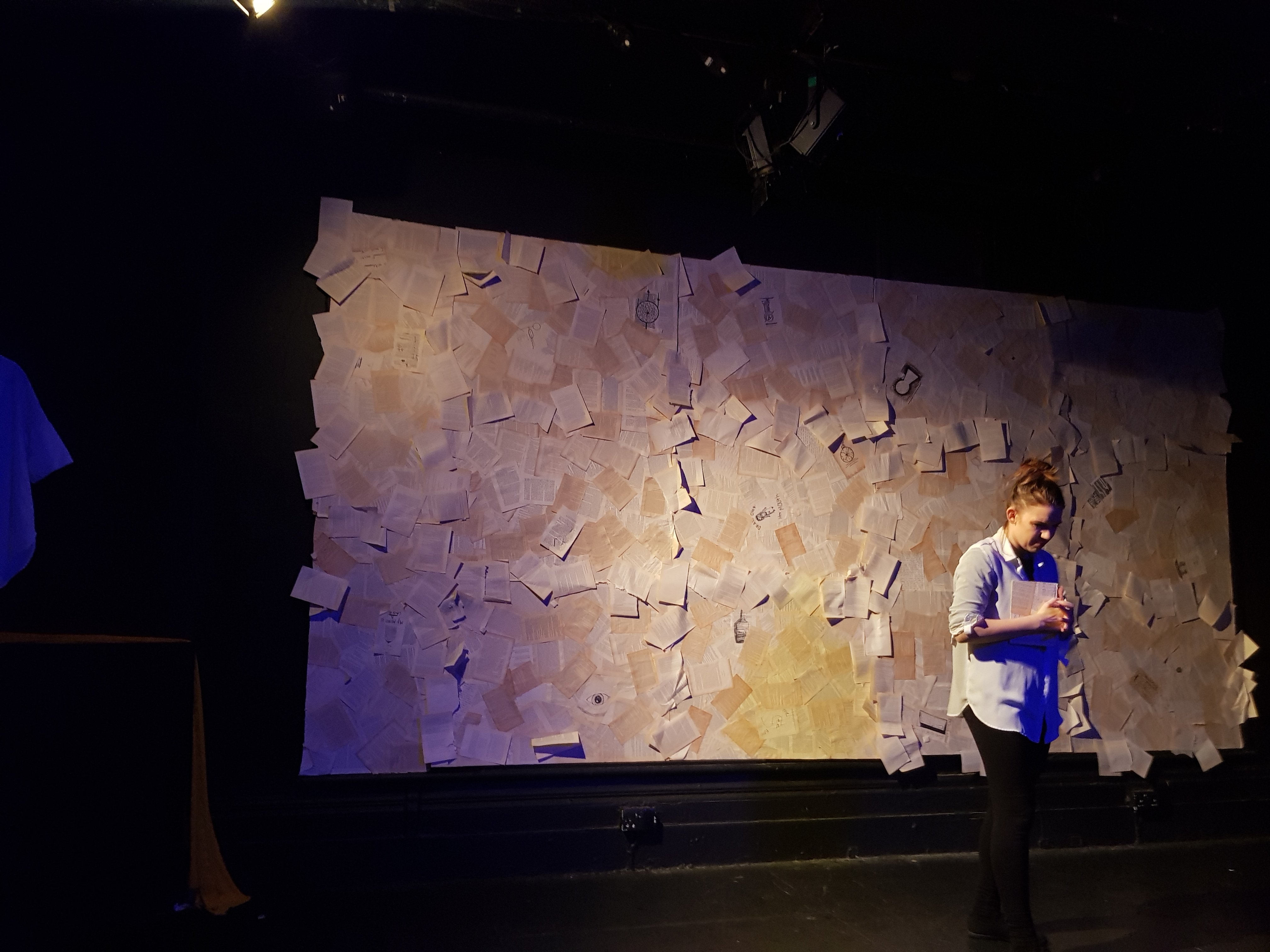 The stage was unusually dressed with the costumes worn throughout the play hung on various wall sections. The actresses putting the coloured clothes over the top of their black outfits once taking on their main roles. The outfits displayed can be seen in the above photo. These transitions flowed very well and did not interrupt the performance. As seen below the collage of torn out pages depict the jumbled thoughts inside the minds of their roles, adding another dimension to their performances.