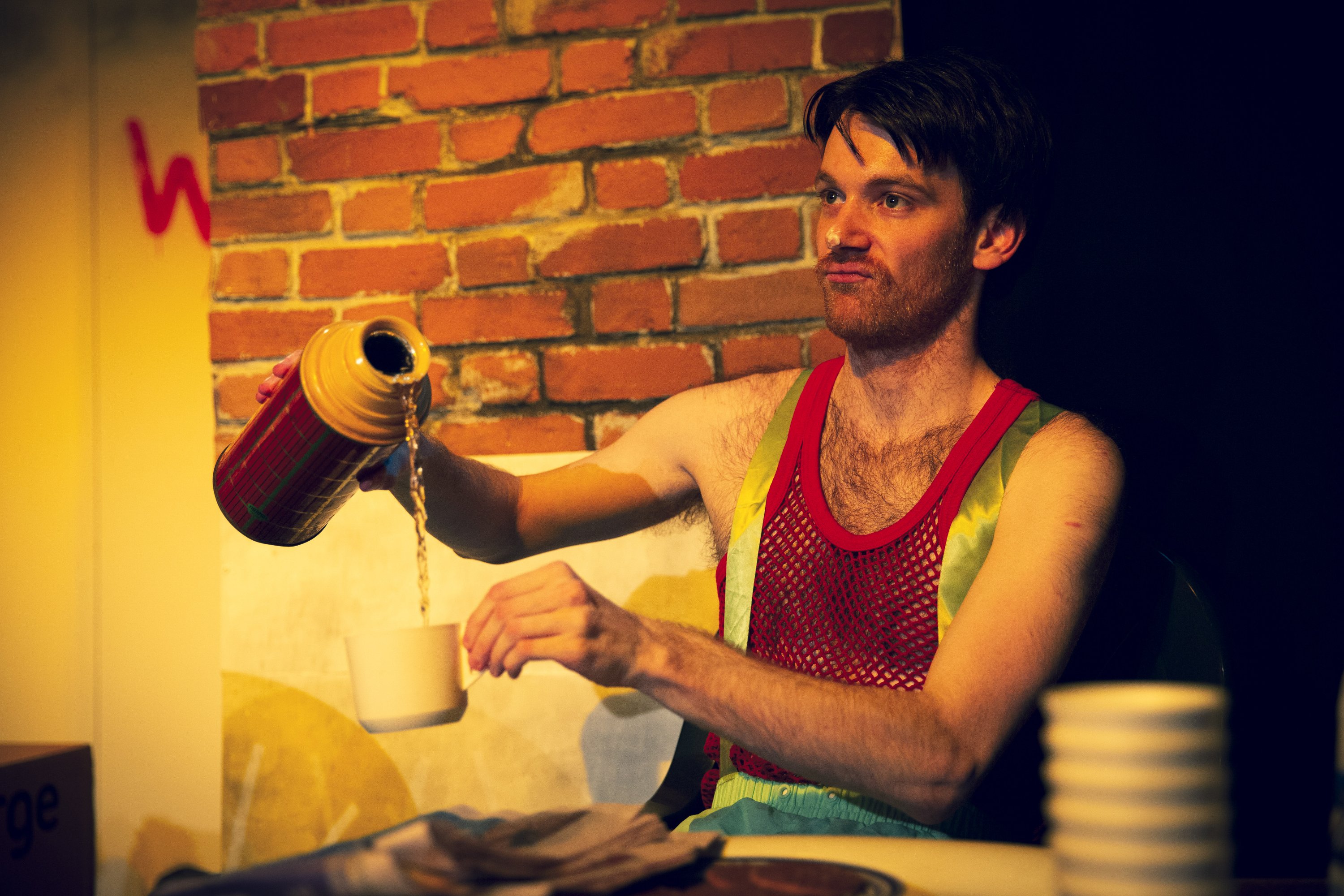 The costumes as seen below add to the colour and humour. The outdated shell suit and string vest all make an appearance. With, Luke Adamson as Algernon can be seen strolling around in his unflattering white pants for a large section of the performance which just accentuates the eccentric lazy Batchelor bone idle attitude he has to life which Wilde first wrote about.