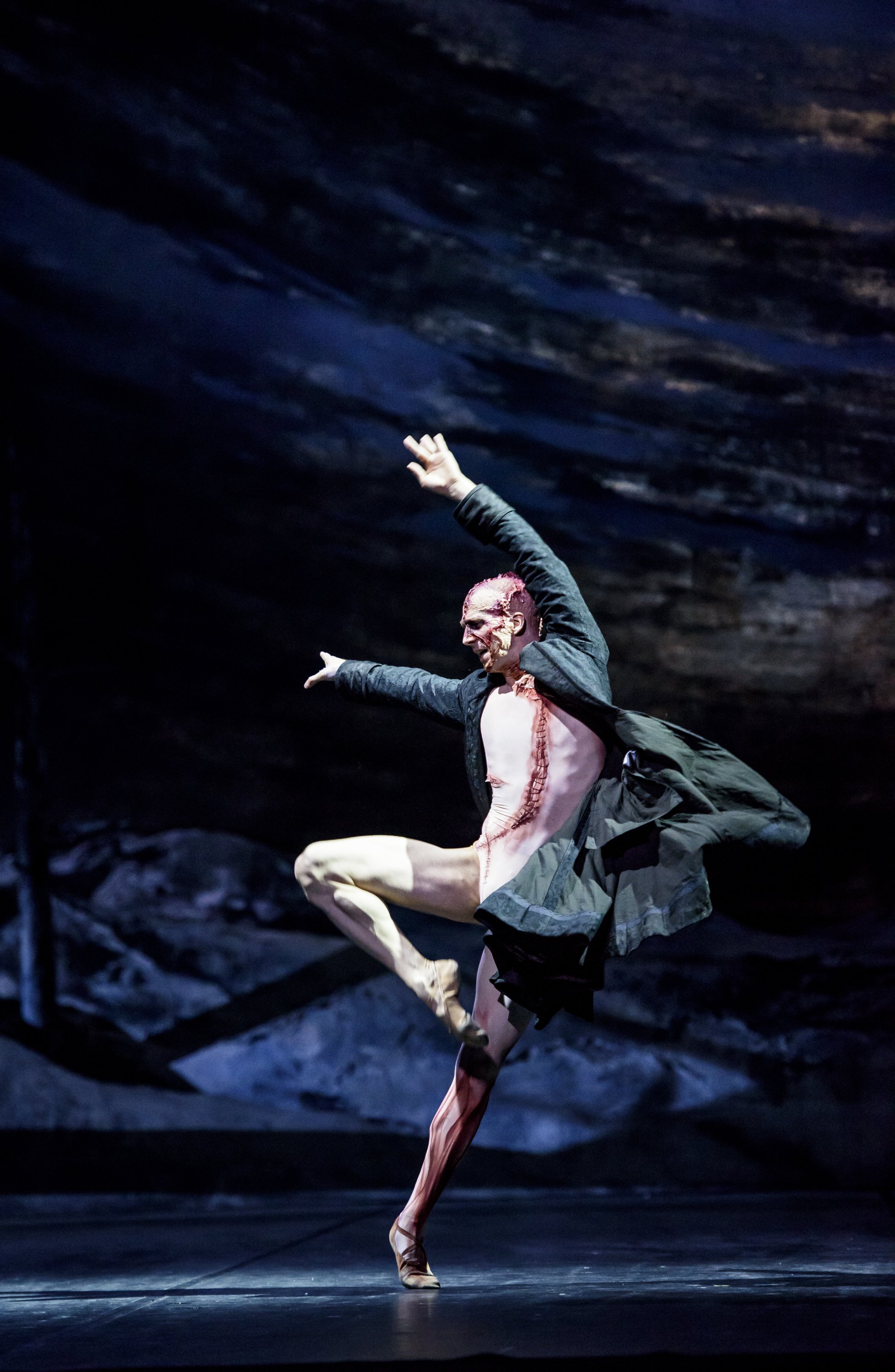 Liam Scarlett’s incredible stage design pictured above. Nehemiah Kish and Frederico Bonelli at the start of the creature’s awakening. Photo credit Bill Cooper.