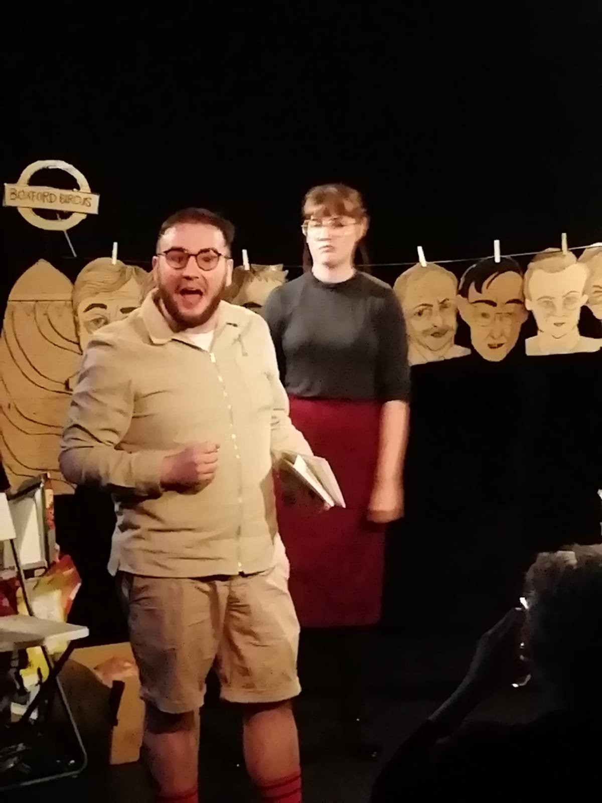 Chojnacki quirky designed stage encompassed all the topics covered within the lecture in simple but effective cardboard cutouts. The character politicians were an excellent addition. Both actors each had a box of selected props next to them which were pulled out as required. Ranging from a pillow-sized bag of crunchy snacks, a Gazza face mask to