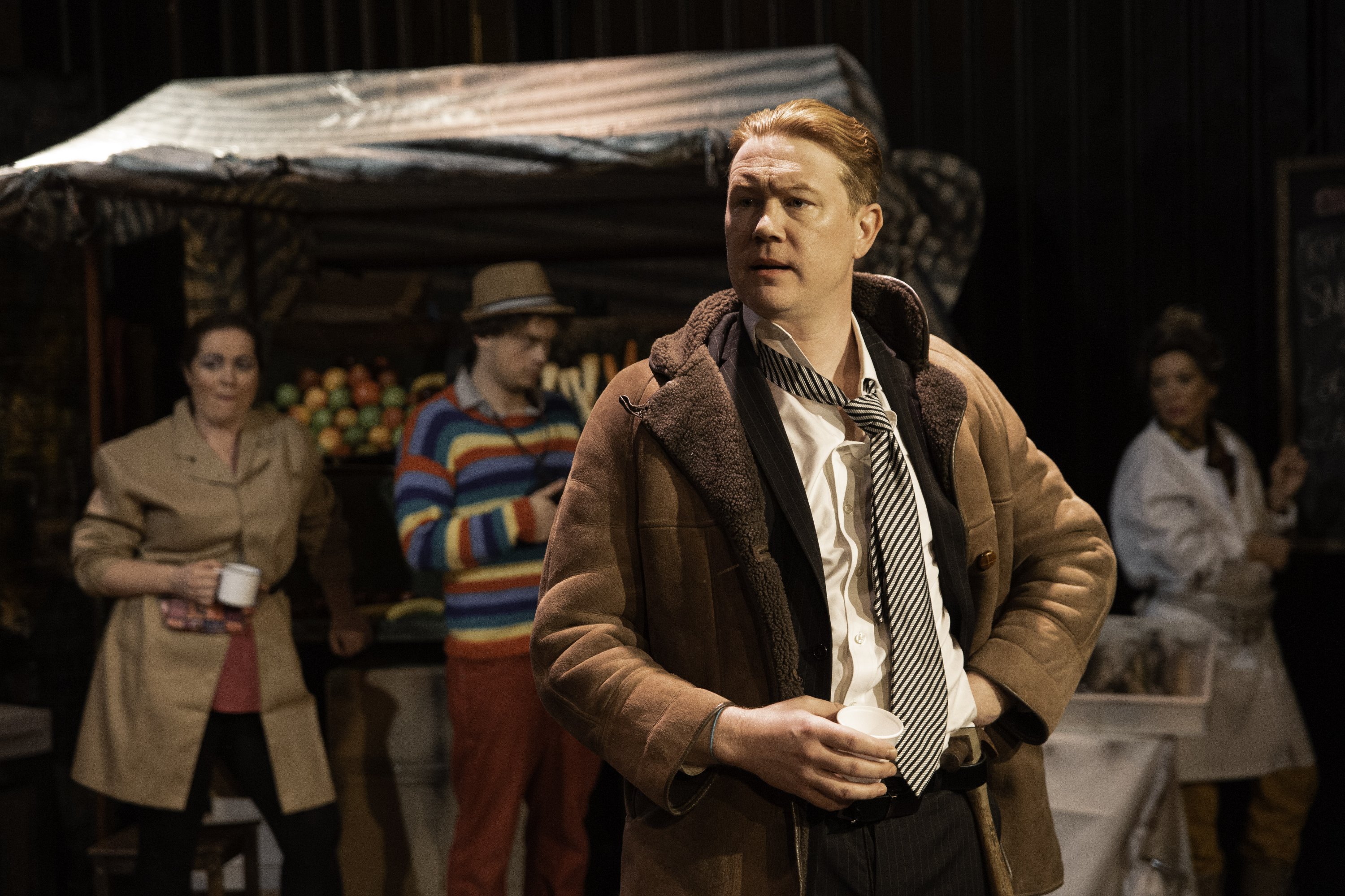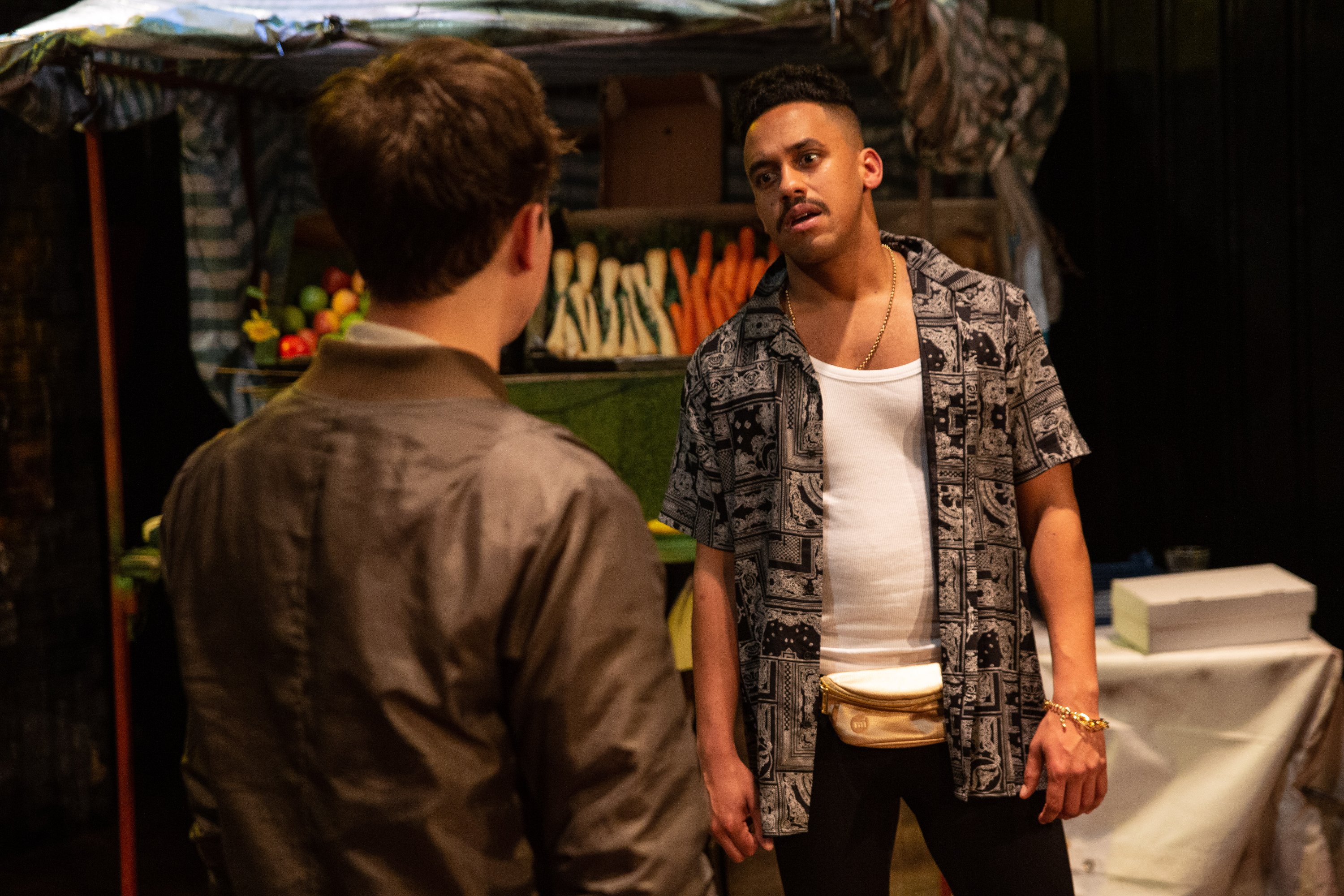 The large energic cast fills the stage at Union Theatre using every available entrance and space around the stage keeping the audience engaged throughout the whole show. Featuring larger than life stall holders. The busy market stalls are easily recognised from the fish stall, fruit and veg, records, clothes and the plays main feature of the shoe stall. Where our main character Brian life journey begins when his Mum gets him the job working there at the age of 13.