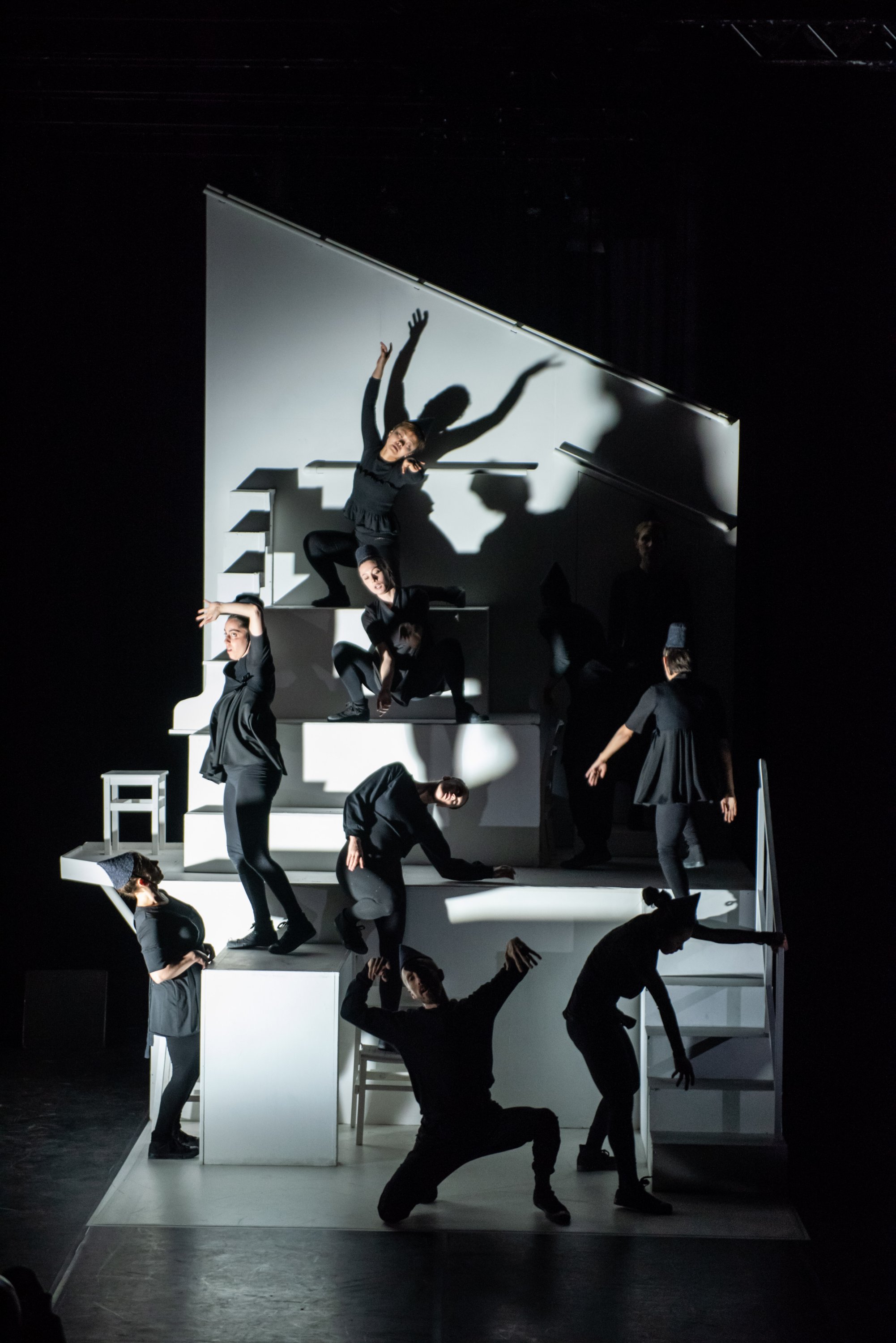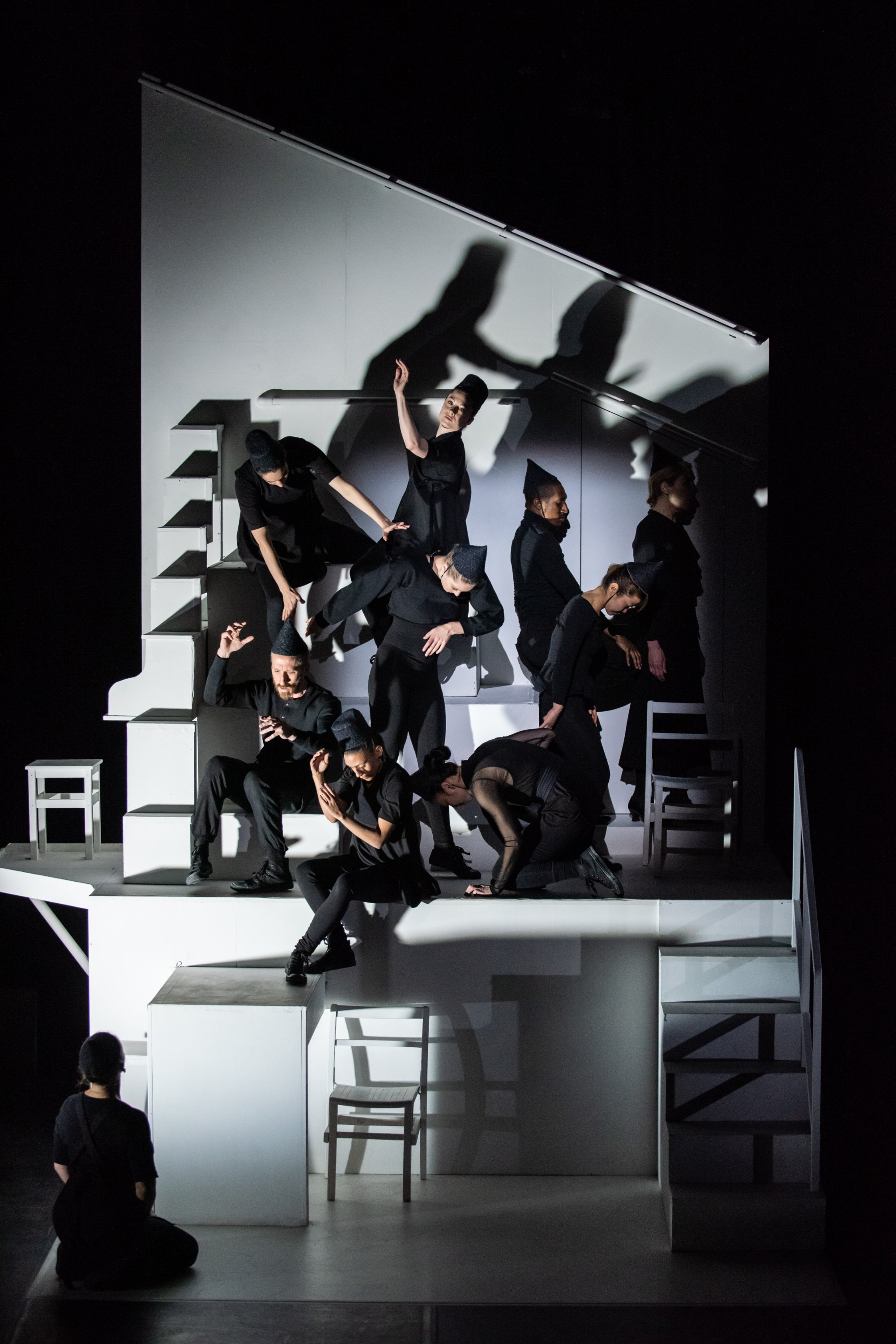 The stark black clothed performers contrasted against the white part sectioned house looked fantastic. The house section which is set centre stage and the vast majority of the performance took place within it. While using every available space, surface and object to fluidly move from each level with what appears to be effortlessly.