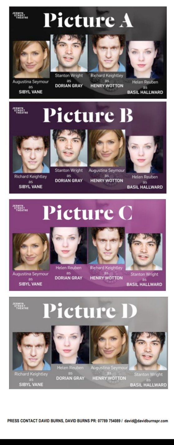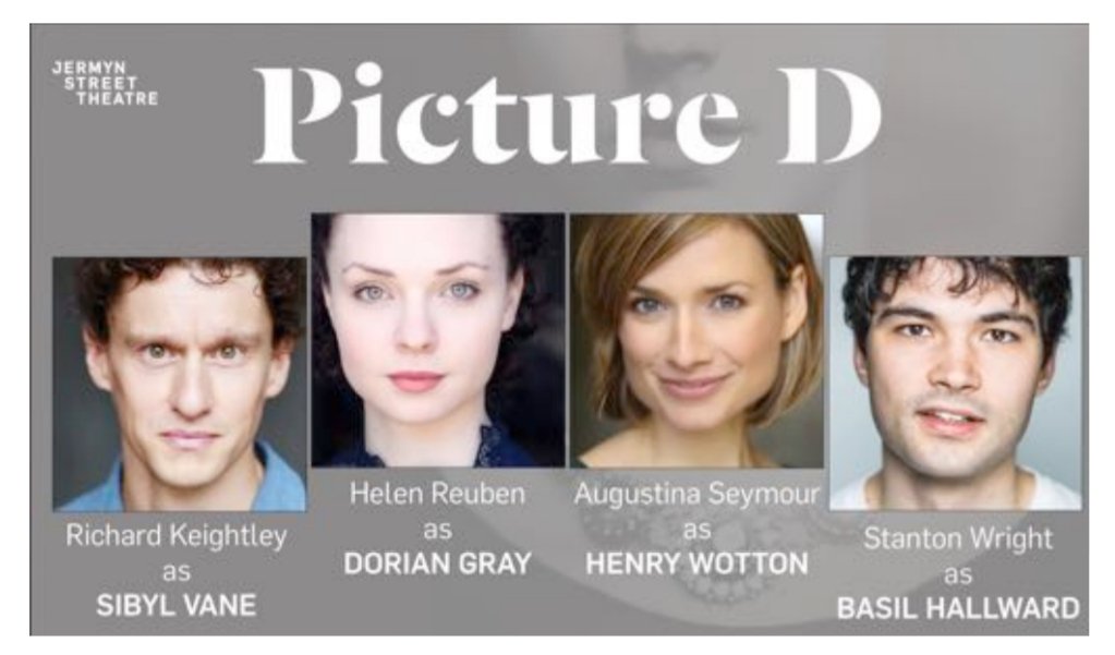Upon arriving at the impressive 70 seater Jermyn Street Theatre you are met by a fantastic array of production photographs and the extremely enigmatic designed poster of Pictures of Dorian Gray.