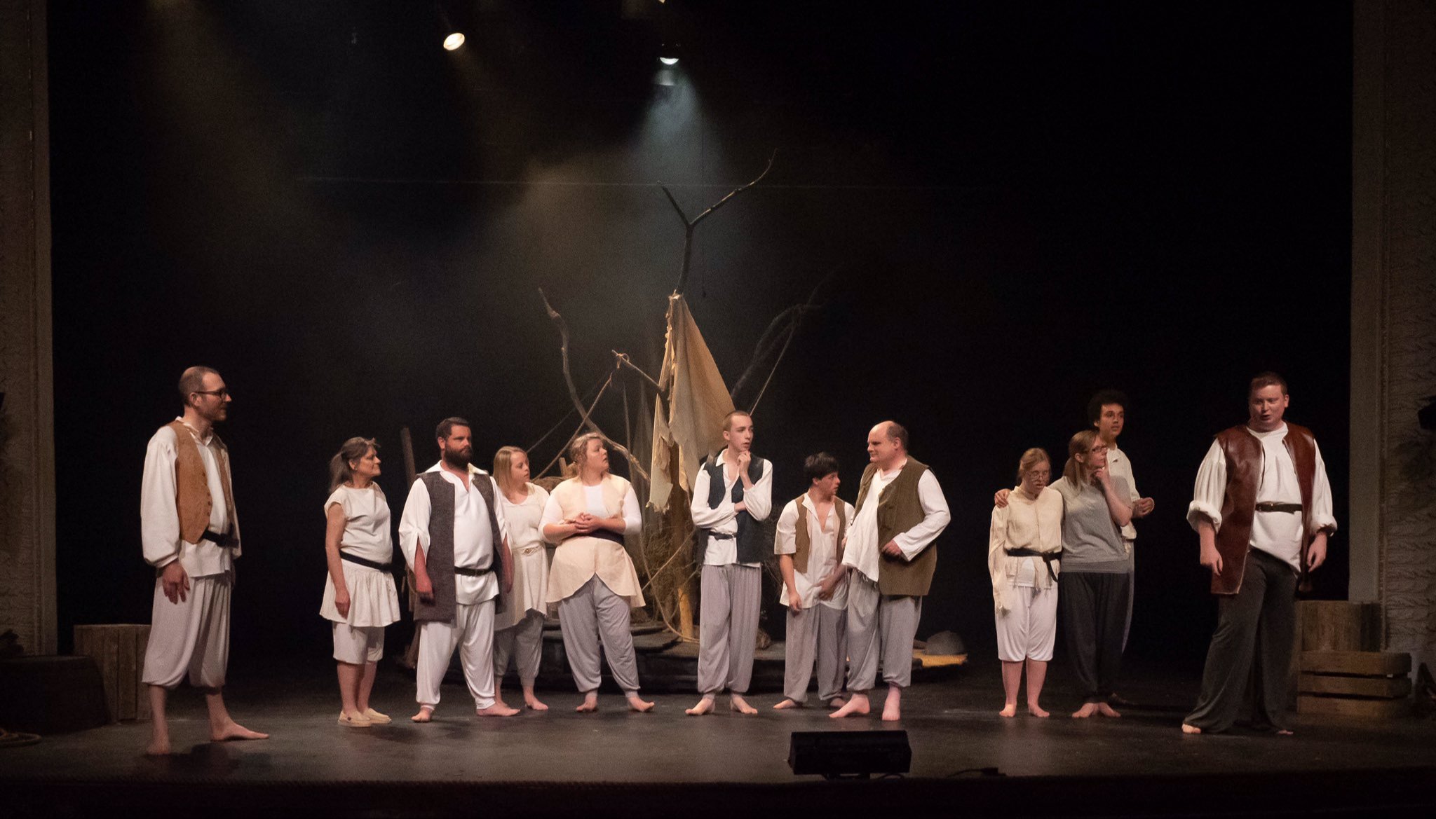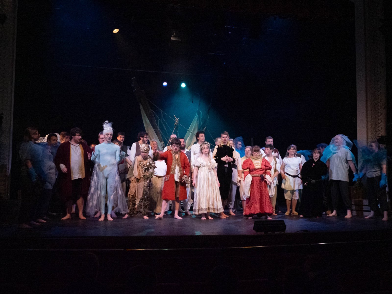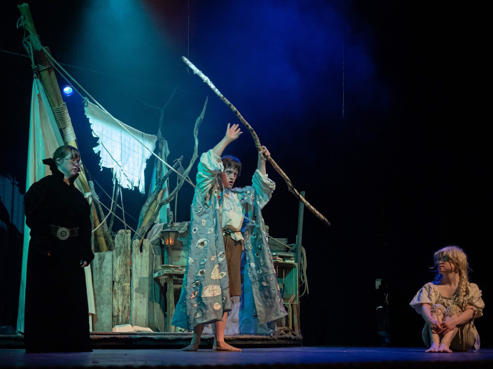 Tommy Jessop as photographed below leads this production in the role of Prospero. On the whole, he is a strong lead and delivers his part with conviction. You can see the other cast members look up to him as they all work closely together on stage.
