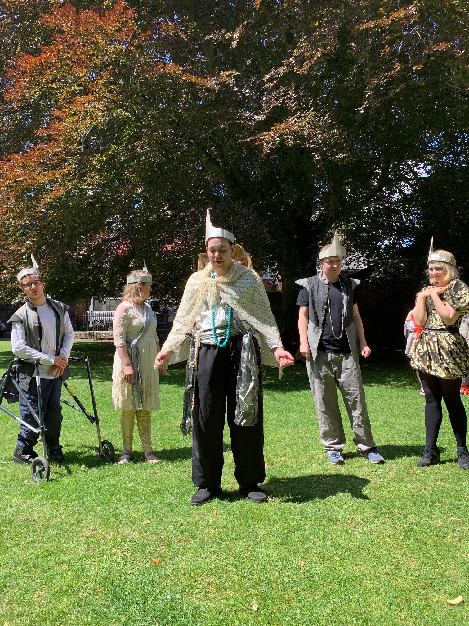 As each village tries in its own way to stop it from continuing they realise that their only real chance of success is to work as one. As the two groups reunite and take on the task ahead the creature retreats realising he is outnumbered and outsmarted.Blue Apple’s ethos of working together and overcoming obstacles when the odds are not in your favour is at the heart of this piece. It never fails to amaze me how the dedicated team who work with the theatre company bring out the potential of each and every member valuing what each of them can bring bro every performance.Despite the heat, they never faltered once and James, disguised as the creature must have been extremely hot inside the heavy creation. As seen in the picture below at the back. The smiles alone show how much they enjoyed the performance.