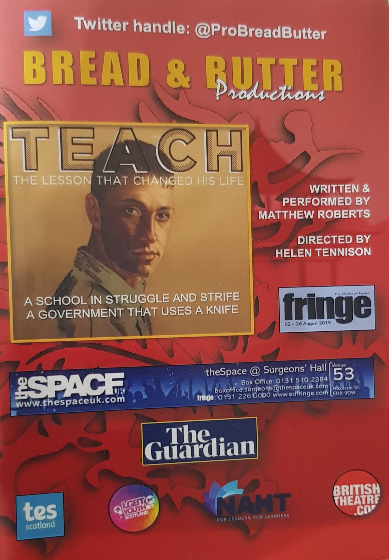 The powerful semi-autobiographical production by Matthew Robert’s at the 2019 Edinburgh Fringe Teach is a “warts and all” fast-moving play about his experiences inside and outside the classroom.