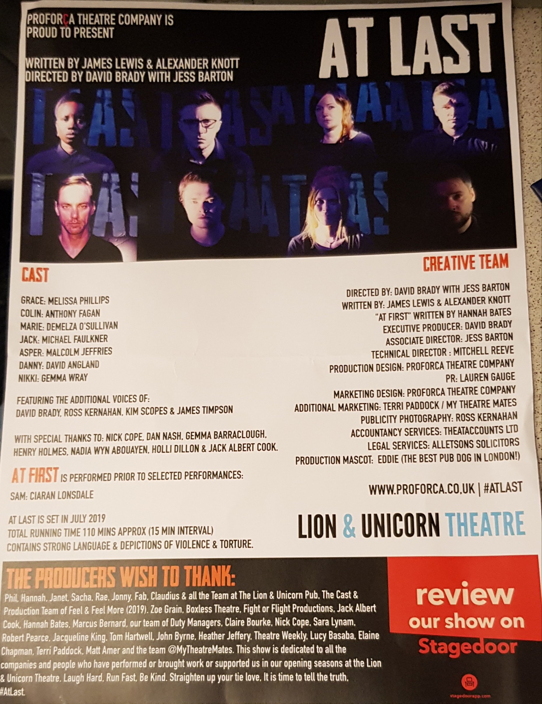 The audience is drawn into all seven of the characters lives. Each of them telling their story about how they view the world that all seven had co-existed within during this unprecedented period in history. No two people experience major life-changing events with the same outlook and with At Last it deals with how these stories vary and regardless of the chosen side they are on each of them struggle to come to terms with the past in order to face the Brave New World.