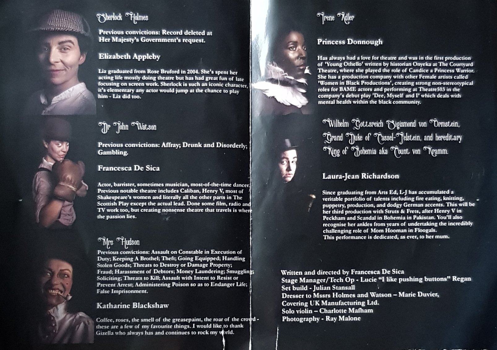The female-led cast of five plays all the roles between them. Sherlock Holmes played by Elizabeth Appleby and his faithful companion Dr Watson played by the writer Francesca De Sica has been very well cast and really good chemistry on stage. Both roles are brilliantly performed and it’s unimportant that the traditional male roles are led by two very talented female actors.