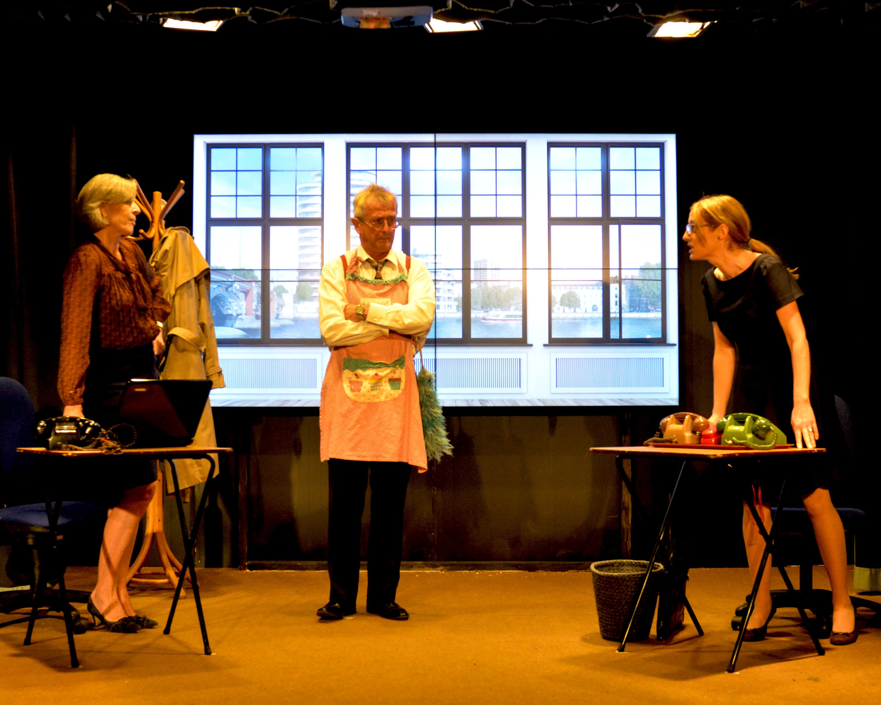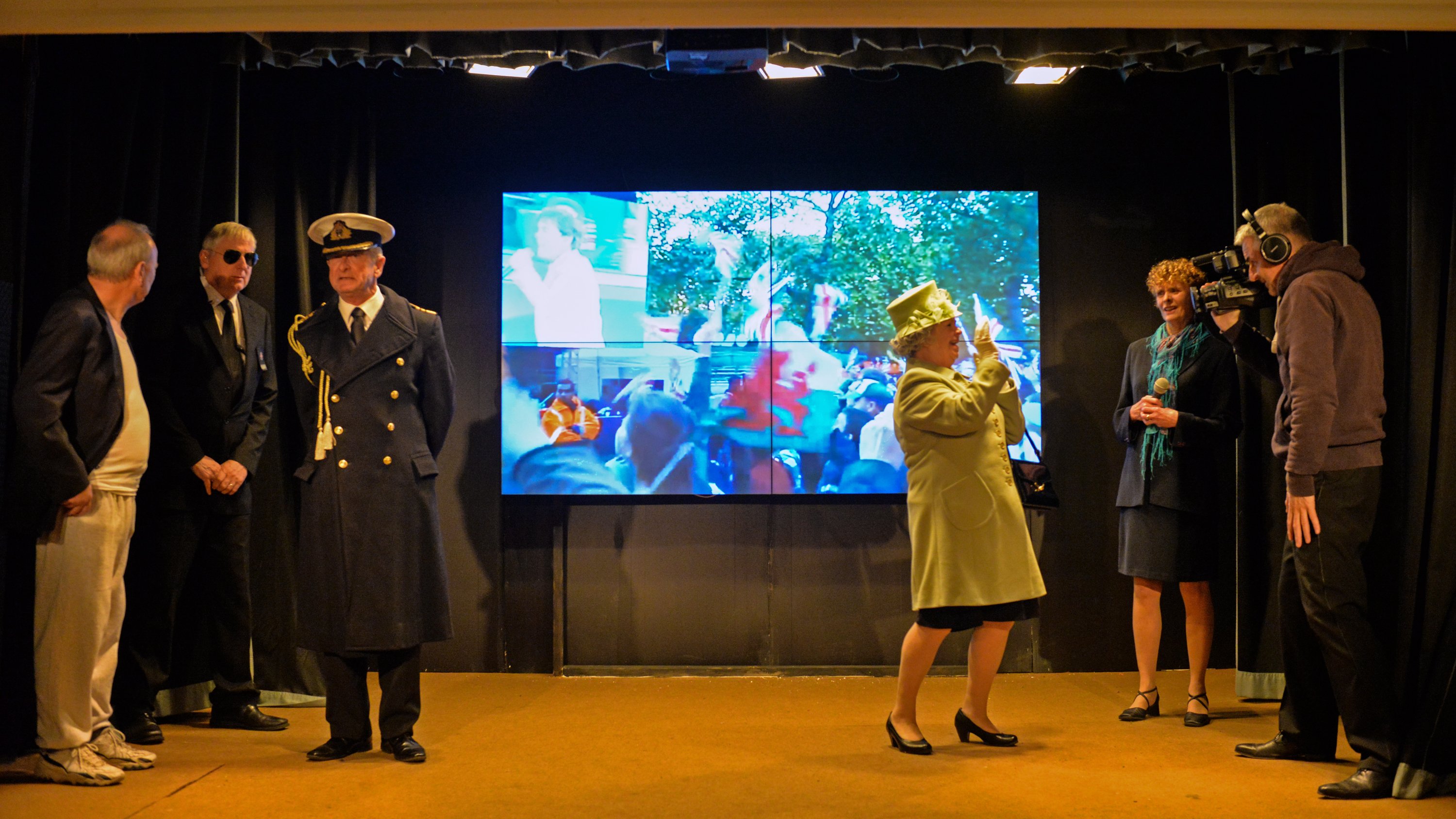 The film scenes which had been filmed earlier in the year are shown on the large screen at the back of the stage which allowed the production to use James Bond-style car scenes in the play and take them off on various locations to bring a touch of Bond reality to the whole production.
