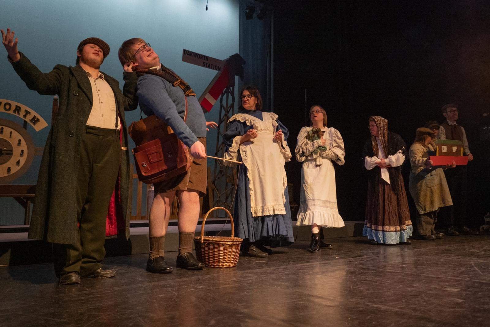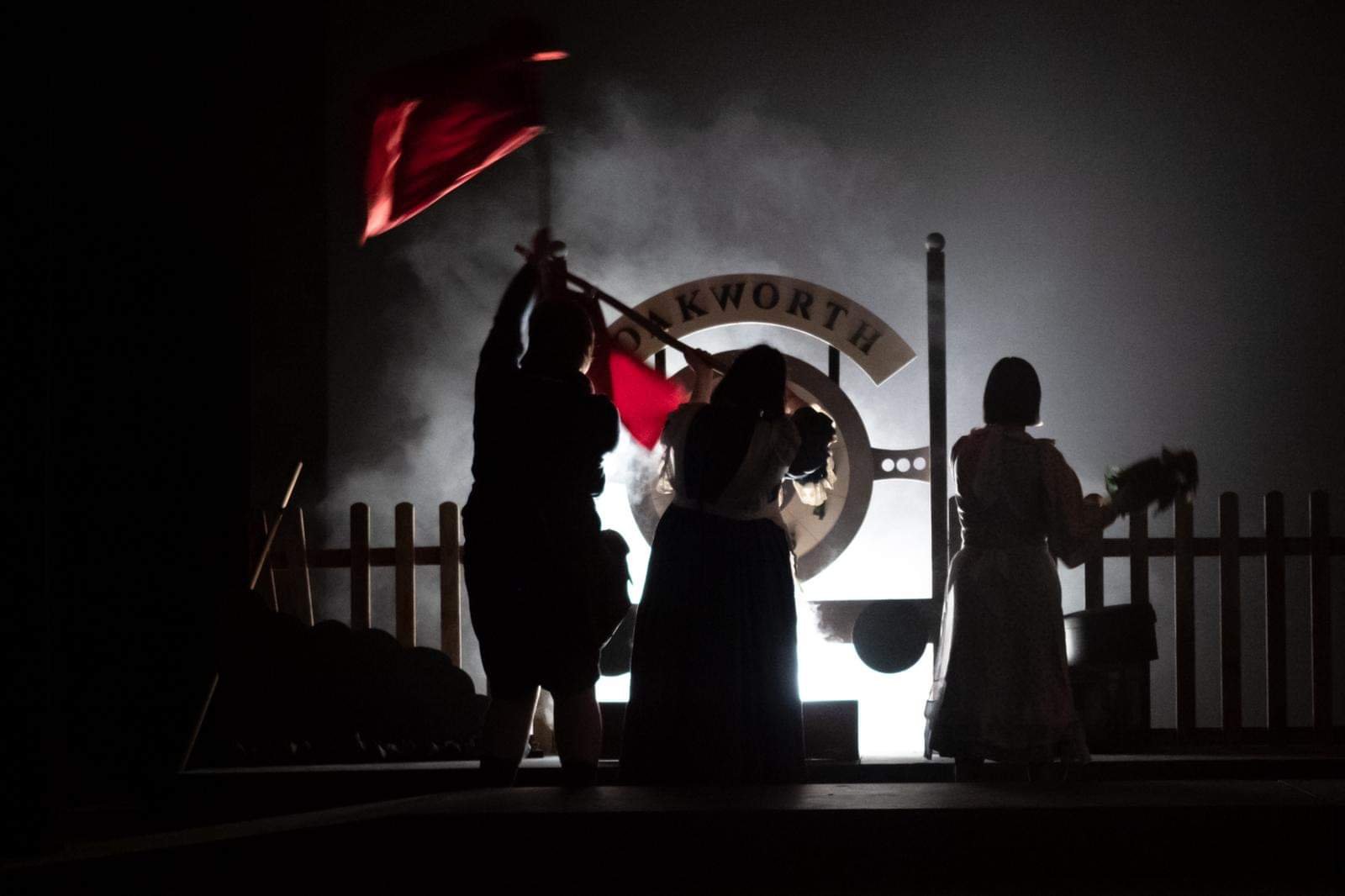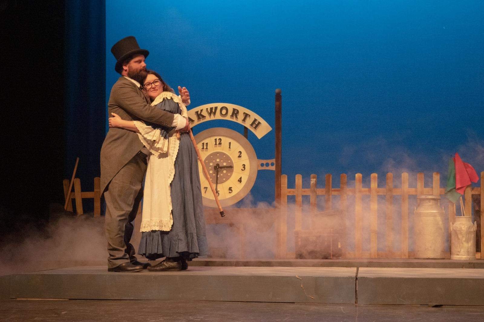 The stage has been designed by Mark Pyke to depict a fully functional working railway station complete with a working carriage train, you just need to suspend your disbelief. The steam train sounds effects worked exceptionally well along with the bellows of steam pumped onto the stage for additional effects.