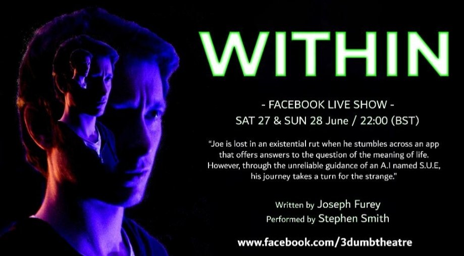 Threedumb Theatre’s latest production Within by Joseph Furey watches a disillusioned and disappointed 23-year-old Joe performed by Stephen Smith in his search to find the age-old answers to “the meaning of life” as he attempts to be “happy.”
