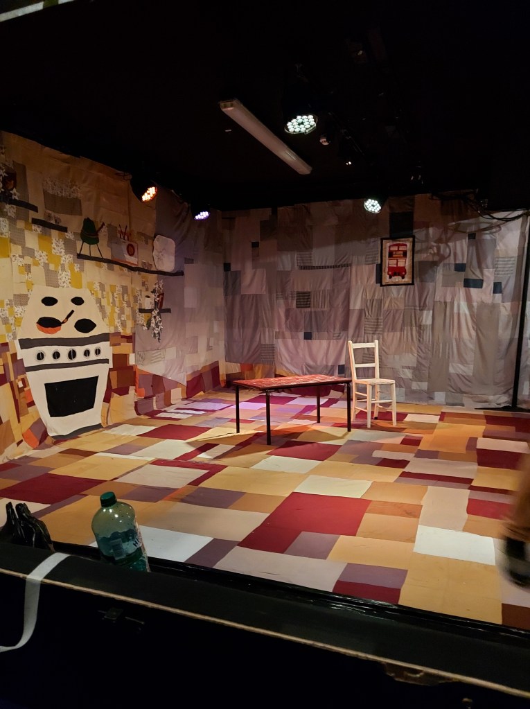 The abstract patchwork stage setting is a touch of genius in my opinion. Each of these patches has been stitched together off centre (as seen in the photo above) characterizing fragments of how Tom’s memories return to him in sections during his clearer moments. Piecing together the life he once lived which is decreasing fast.
