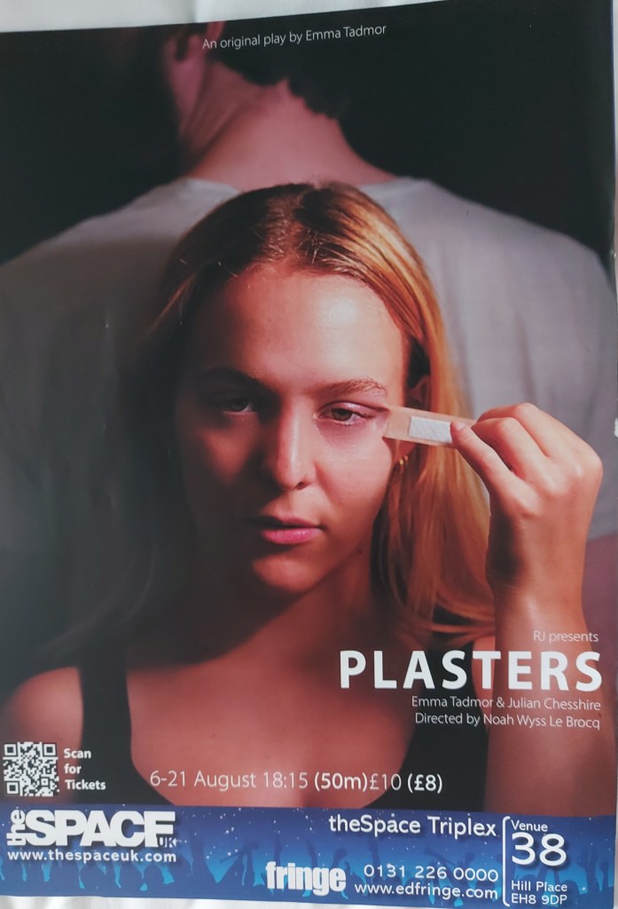 The title Plasters is an interesting choice as the conversations between thw two characters appear to take on that role throughout. Plastering the messy “bits” and damaged emotions over with temporary discussions without ever seeing whether the wound underneath has healed.