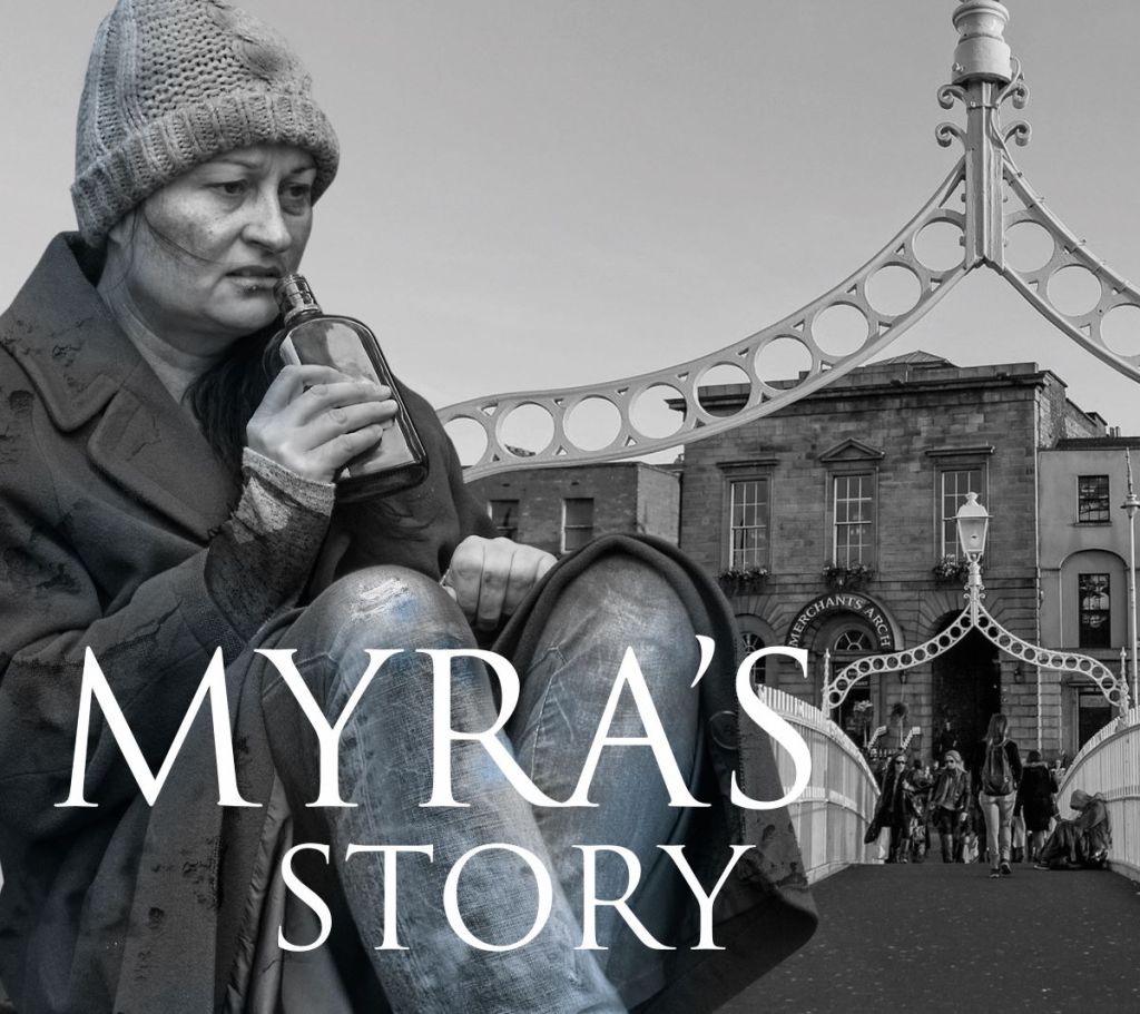 Set against a lobe park bench, we meet her after a long drunken night in which she had been celebrating the night before for her Forthy eight-year-old Irish born Myra living on the streets of Dublin. Desperately trying to scrape together enough money for her next drink.