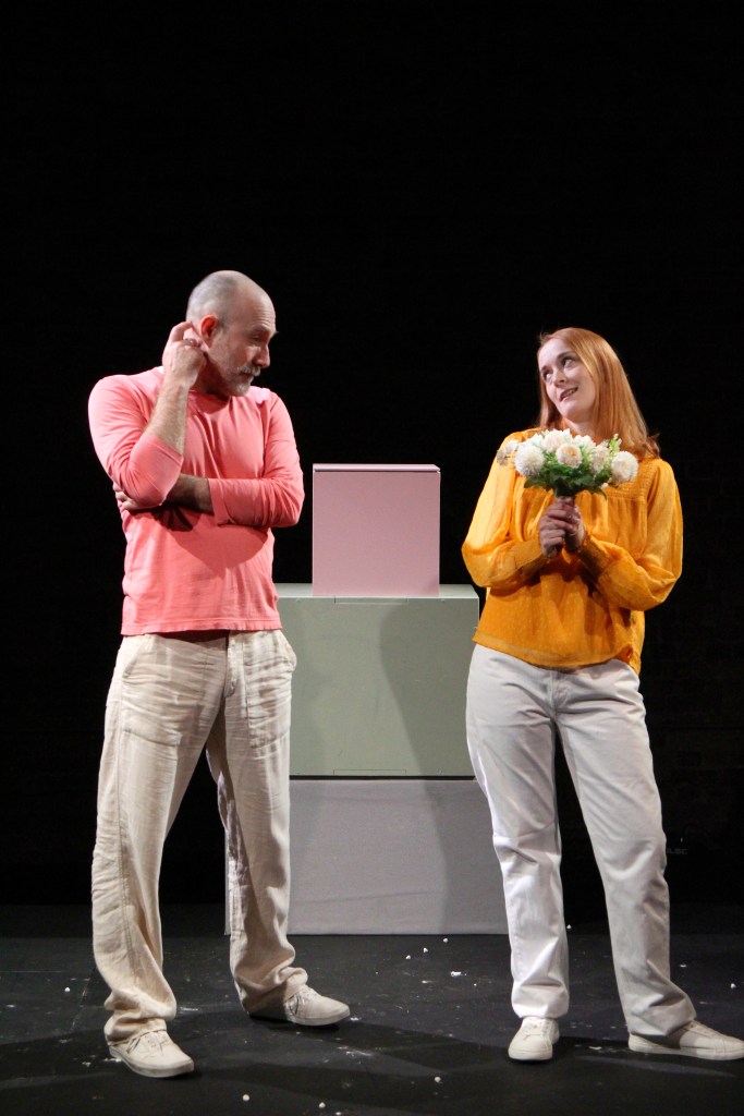 Thirty-six-year-old Clem (Stephanie Fuller) enters the stage launching her unused, discarded eggs across the stage and haphazardly into the audience. Each one represents up to now a sigh of relief that her life has not been “interrupted” by bringing another life into it. Adamant that she doesn’t want children will meeting Luke (Dickon Farmar) change her opinion about this or will it be too late?