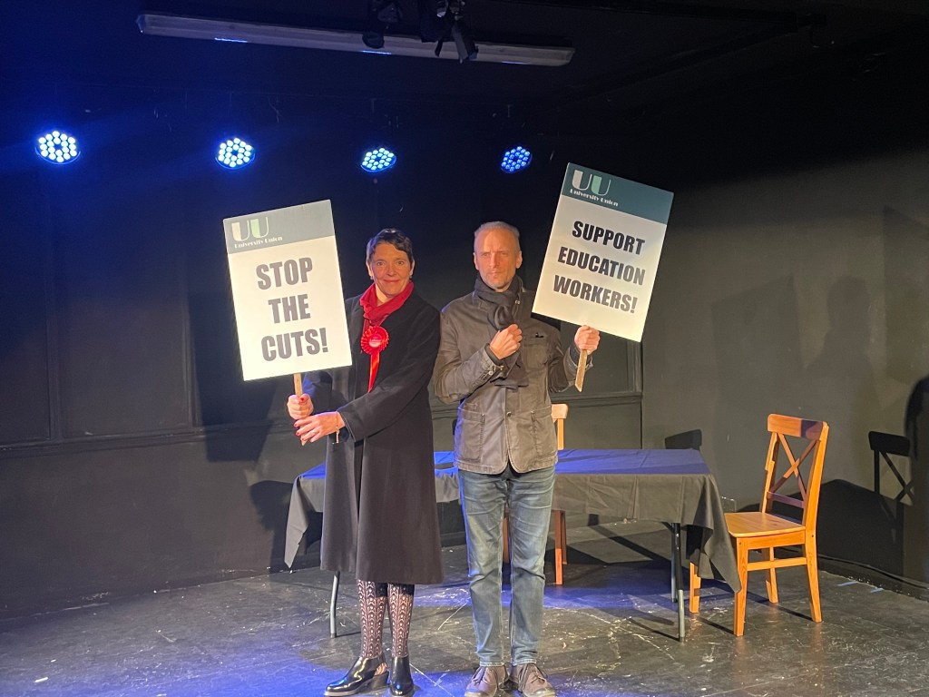 Local MP Sally Finch (Antonia Beamish) actively supports local University Lecturer Jim Marr (Michael Palmer) on the picket line as he protests against the further proposed cuts in Education. However, when he meets Sofia Peters (Catherine Adams) she isn’t as quick to support as nobody was there to represent her Mother whose cleaning job in the University was unfavorably changed without consultation and came out against these changes to protect her interests and future.