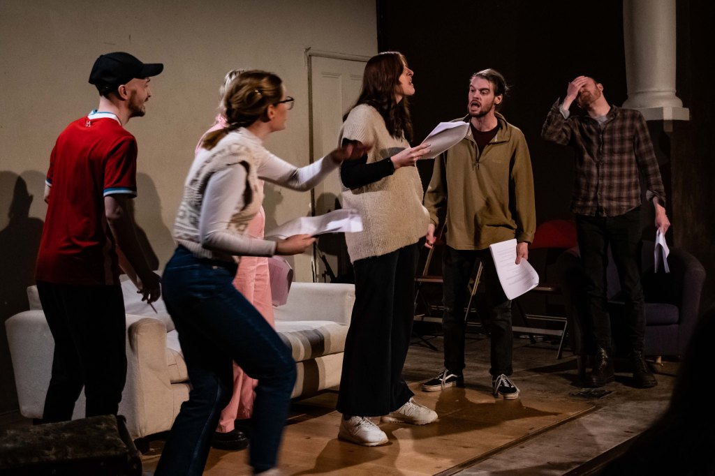 Permanent Tenants by Louis Gale an interesting idea where five housemates are killed by carbon monoxide poisoning due to their negligent landlord. The cast of six were still reading off script. With all the stage directions and prop details read out too, the production is quite a way off being finished.
