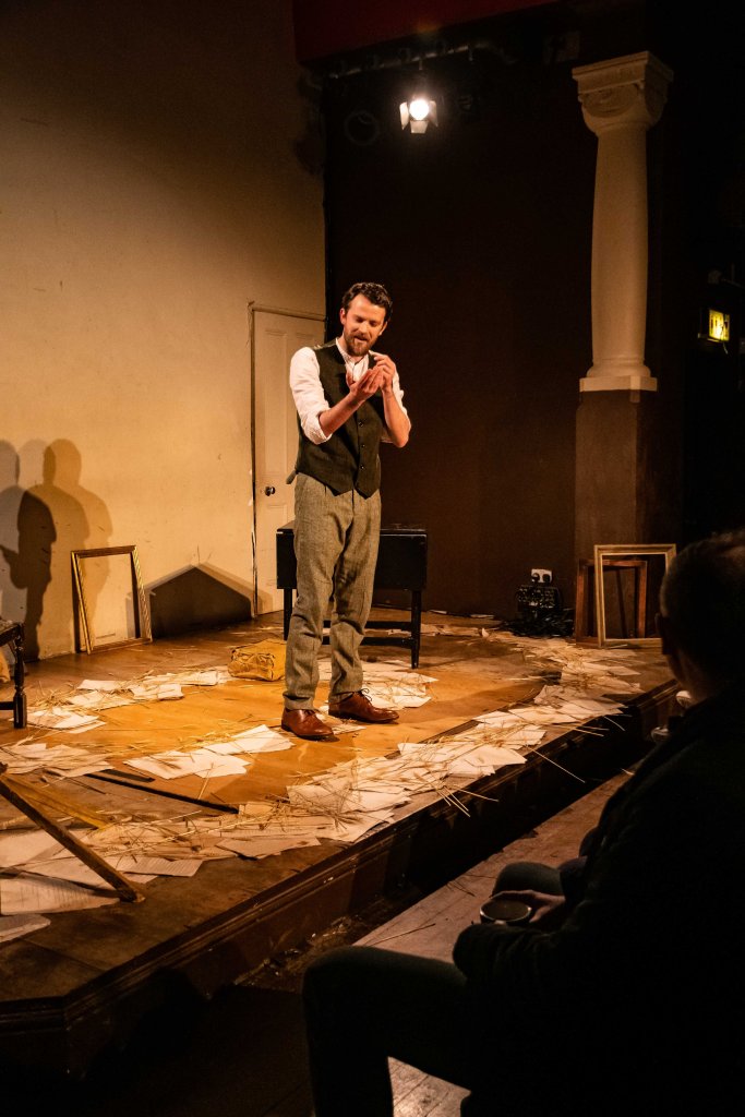 Although, at times, it felt slow and would benefit from editing. Covering the floor of the stage with papers and props left the majority of the audience at a disadvantage from not being about to see what he working through or looking at.