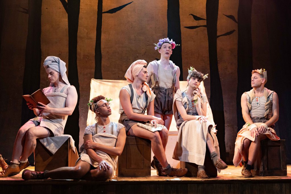 Set in the 1950’s during a Scout camping trip (that’s my interpretation of the setting) the classic storyline of The Mikado plays out. Love, lust and a few awkward twists along the way makes for an entertaining evening. Miss Violet Plumb ( Sam Kipling) is promised to the much older Mr Cocoa (David McKechnie). However, Violet has fallen in love with Bertie Hugh ( Oliver Bradley-Taylor). Mr Cocoa agrees to their marriage as long Bertie is beheaded within a month leaving Violet free to marry him. The path of “true” love doesn’t exactly go to plan!