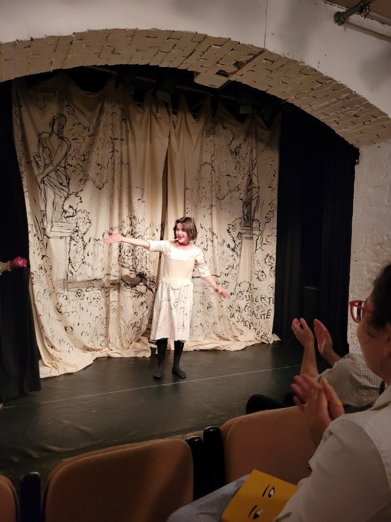The scenes of the french revolution and places Théroigne de Méricourt stayed and visited are drawn onto six large curtains dividing the stage into three scenes starting at the back. As each one is drawn the stage becomes shorter and cramped until she is finally trapped into the small asylum space where she has been locked away for many years.