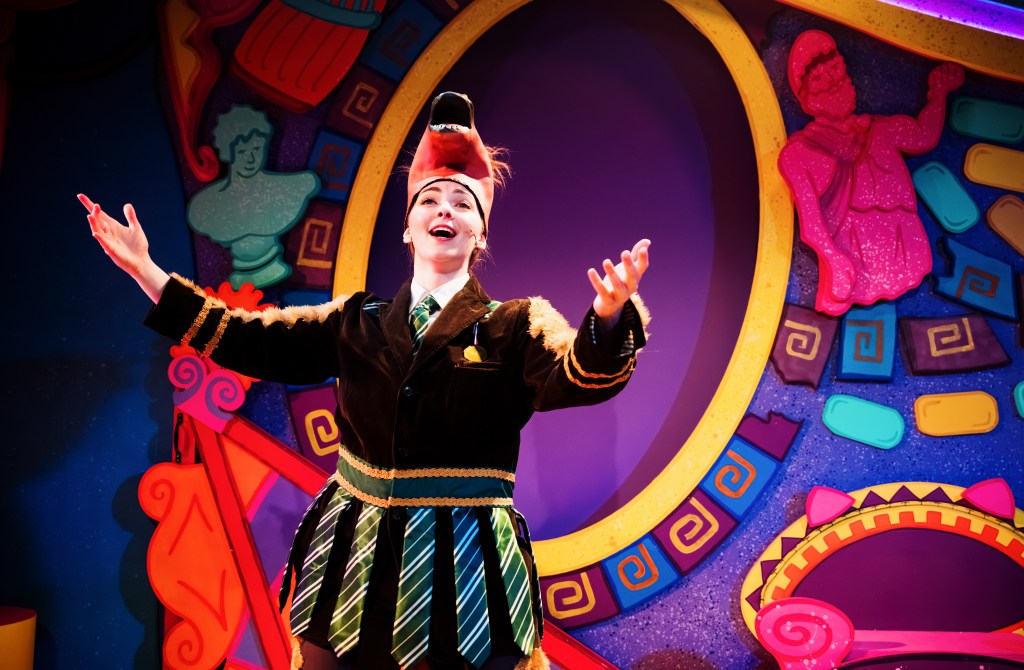 The colourful stage backdrop fills the back of the staged area and the cast uses various built-in windows throughout the performance to enter the stage and add comedic sections. Neon lights advertise that the cast are at Mount Olympus.