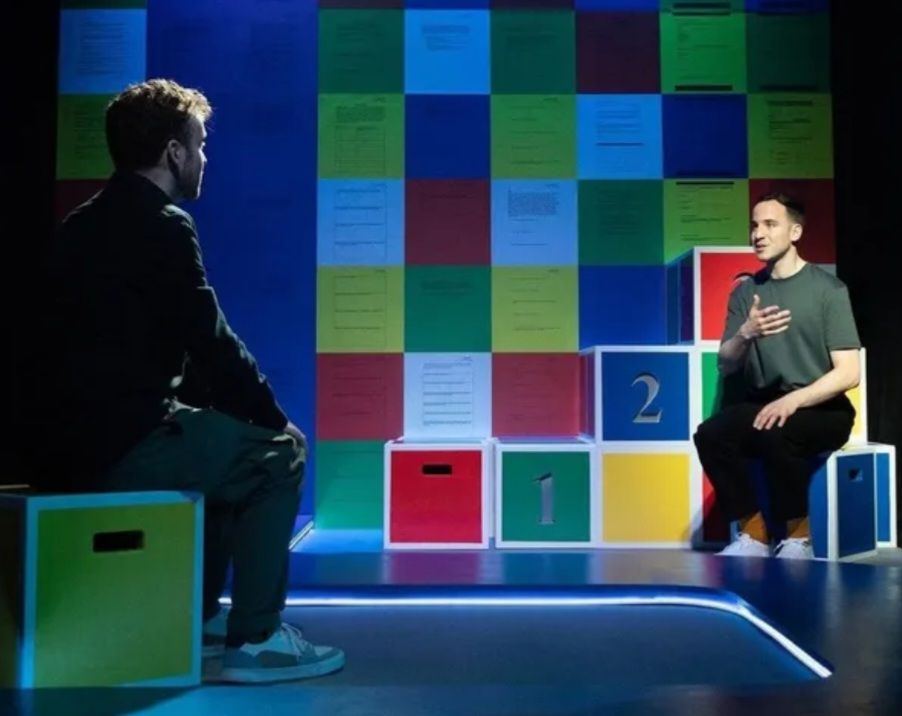 The stage is striking with bright coloured blocks resembling toddler’s building blocks which display the pages from the adoption workbook that the couple are required to fill in for the agency. Which offers an insight into the arduous paperwork they had to face.
