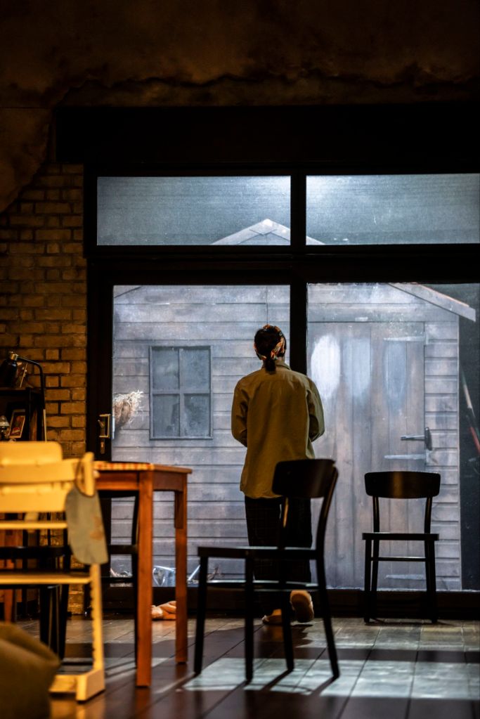The stage designed by set designer Anna Fleischle offers a fantastic platform where the audience can see parts of the original features and wallpaper against the “improvements” which are taking shape. The outlines of the photographs which once hung on the old-fashioned wallpaper gave a glimpse into the life the house once lived.