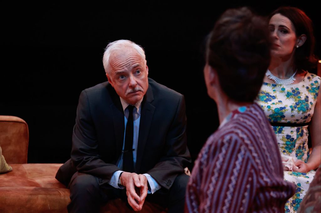 Set and costume designer Sarah June Mills makes good use of the revolving stage in the main theatre at Park. The cast slowly revolving during some of the discussion scenes allowed the audience an opportunity to see the whole cast in the round stage layout. The 1960s ladies’ fashion blended dresses from the era and the move into leisure trousers that was taking place during that era.