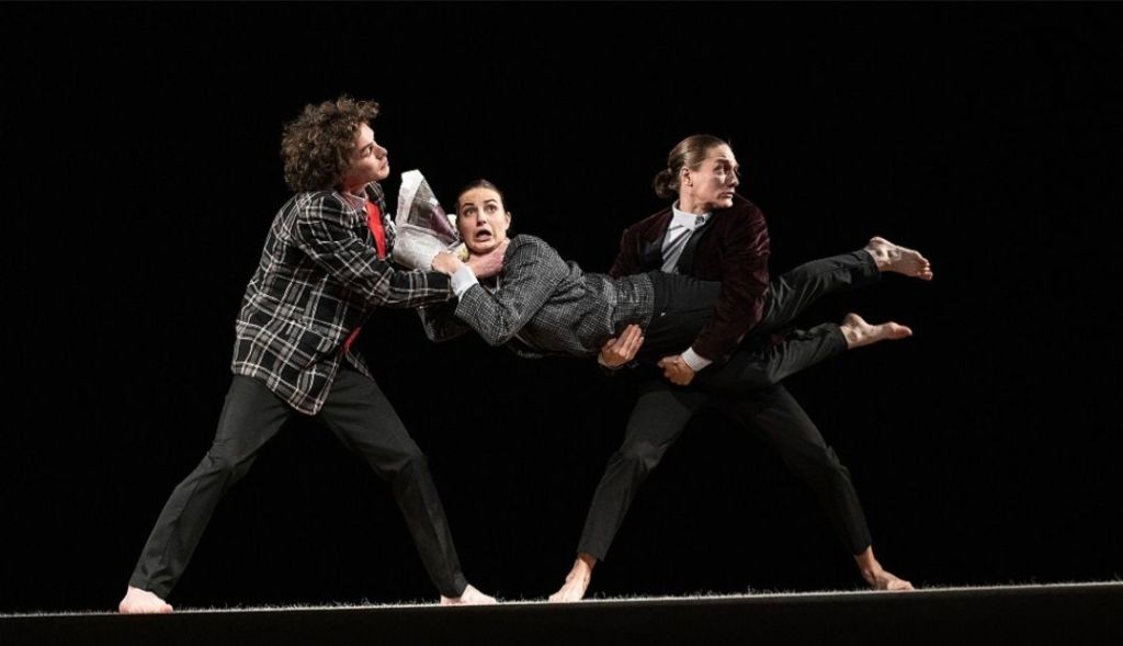 Ukrainian mime performers Kata Spondoneiko, Pasha Vyshevski and Olexander Symonenko literally turn the newspaper inside out, shred it and put it back together as control passes from one to another.
