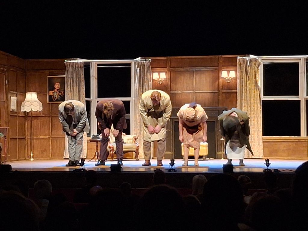 Olivier award-winner Louie Whitemore’s set and costume designer brings the essence of a manor house to the stage with a large wooden cladded reception room, an old-fashioned wooden radio that answers back along with an authentic fireplace.