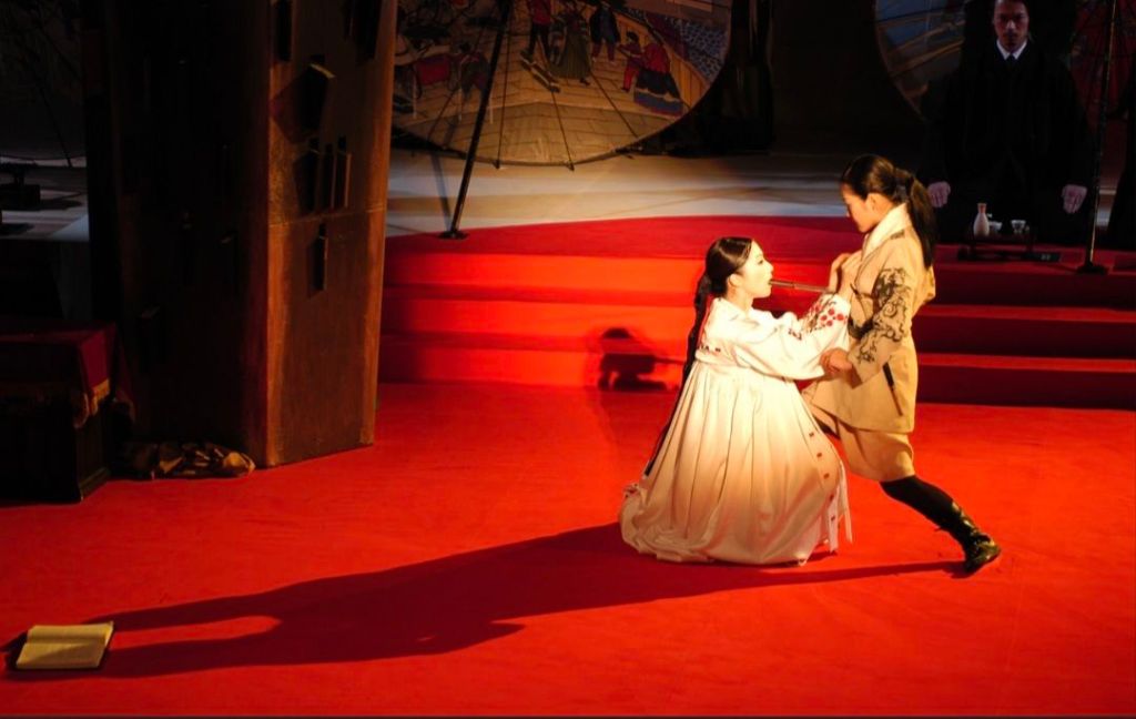The company is known for its performance style of separating each role into what it calls a “speaker” and a “mover.” The male speakers use a bunraku-style chanting technique, to give voice to the role while the female movers engage in stylistic movement, inspired by Japanese forms like bunraku puppetry and kabuki dance ningyō-buri. This technique highlights the ways in which women’s voices have been controlled or suppressed in patriarchal societies.