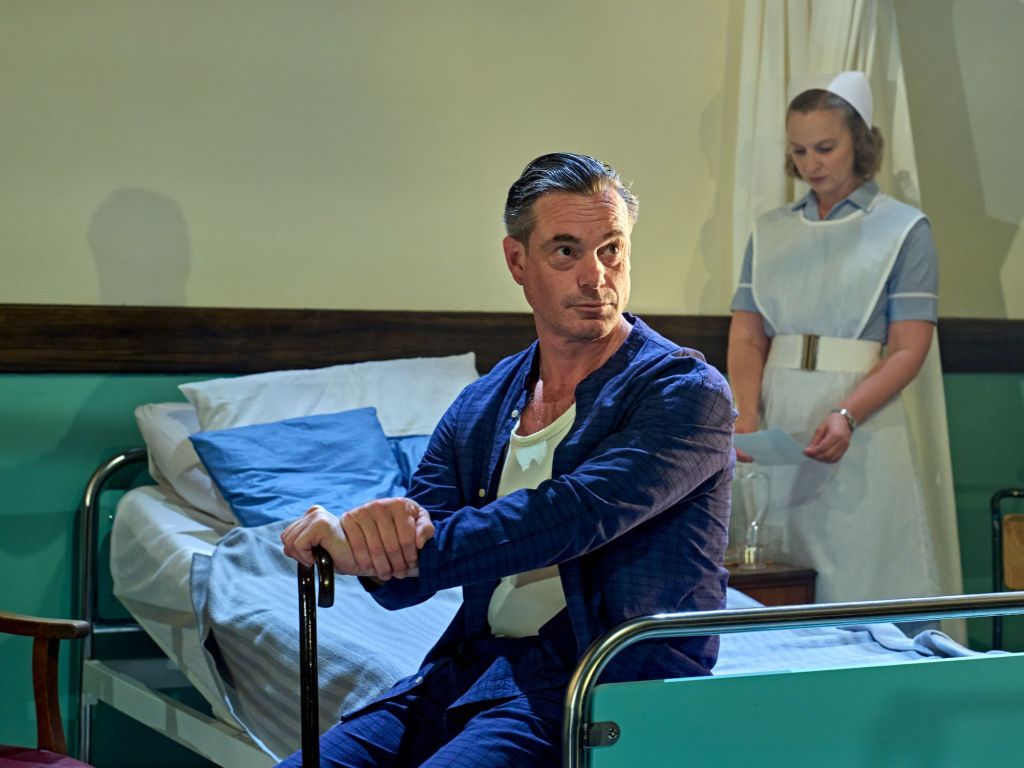 Bob Sterrett’s set features a hinged edge which transforms the functional hospital room into a variety of ingenious scene settings. Stained glass for a fashionable restaurant, thick red curtains for the Old Vic, all integrated seamlessly and efficiently, which is particularly impressive given the size of the stage.