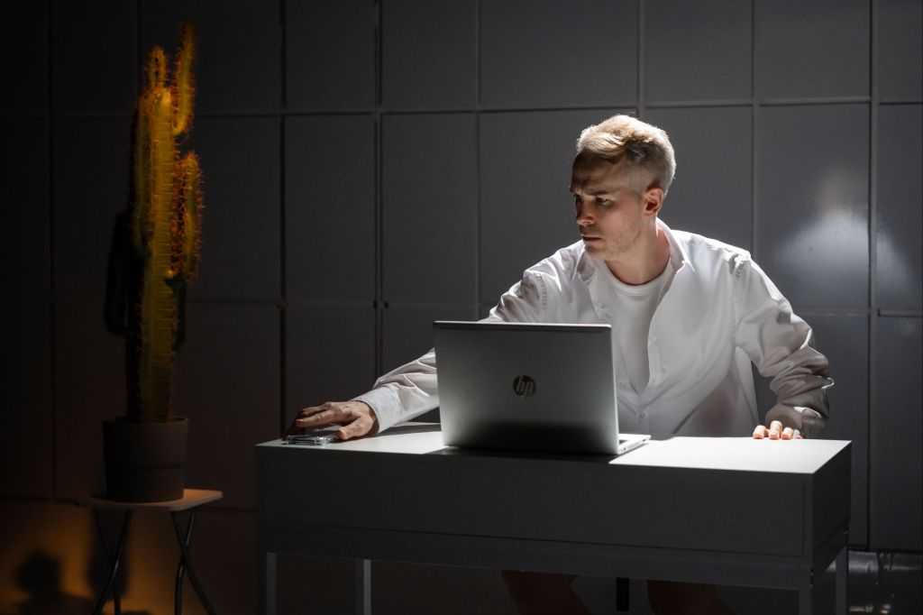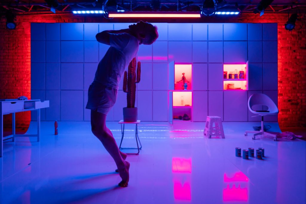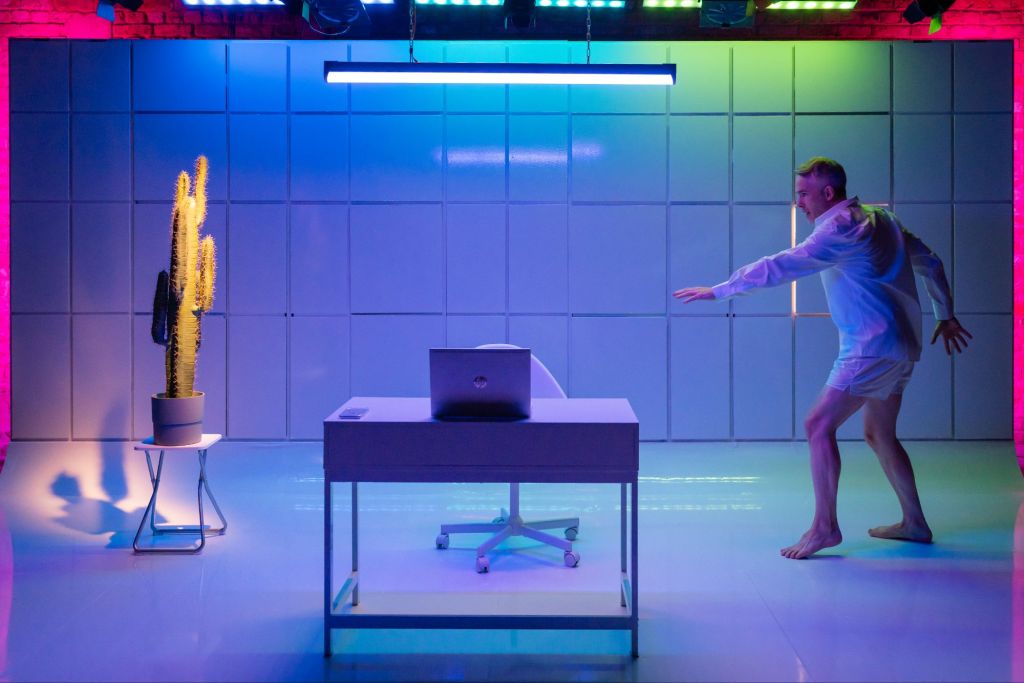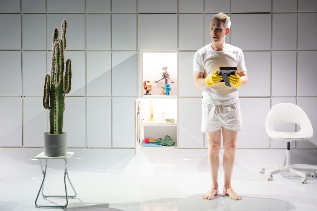 Clive, showing at the Acora Theatre follows the life of Thomas (Paul Keating) after a restructuring at his workplace found all employees working from home. Initially, Thomas is happy to work at home with his ‘friend’ Clive, a large, prickly cactus for company. A sterile atmosphere is created by a white workspace and desk. It emphasises Thomas’s compulsive cleaning behaviours and his enjoyment in keeping his home spotless.