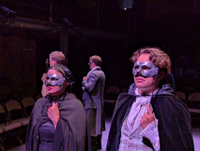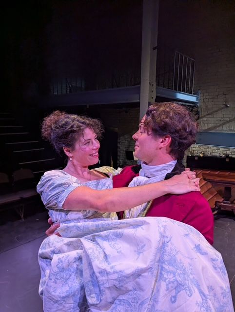 The set design is intentionally understated, consisting of only a table and two chairs repositioned by the cast as needed. This minimalism keeps the focus on character and gesture. Costumes summon the Regency era with empire waisted dresses, elaborate hats, and scarlet uniforms. Although there were a couple of wardrobe malfunctions.