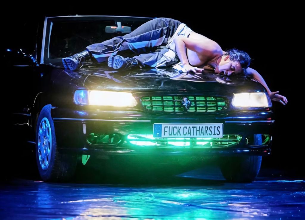As she settles on the desk, the Bianchi’s Cara de Cavalo dance troupe appear and take down the white screen. Unravelling the replacement black plastic sheet, they reveal a black car with the registration “Fuck Catharsis”. The car, silently watching, in the blackness, becomes the site of simulated violence, sex and invasion. Bianchi is changed into a nightgown and put on a mattress. The ensemble, after pouring tequila over both themselves and Bianchi’s body, start their fevered party scene like Dante’s Inferno, imitating orgies and violence, gyrating and pulsating.