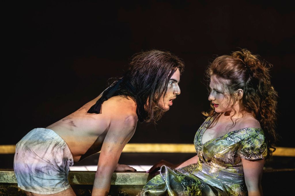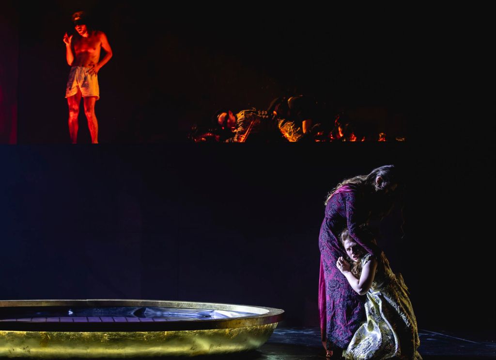 The stage has a large paddling pool-sized bowl with water inside dominating the centre of the stage. It’s used throughout the performance especially when Salomé is under the spell of Jokanaan’s (Shir Sayag) songs, he is the imprisoned prophet who appears in a box at the back of the stage when he speaks out about his prophesies and condemnation of Herodias’s actions.