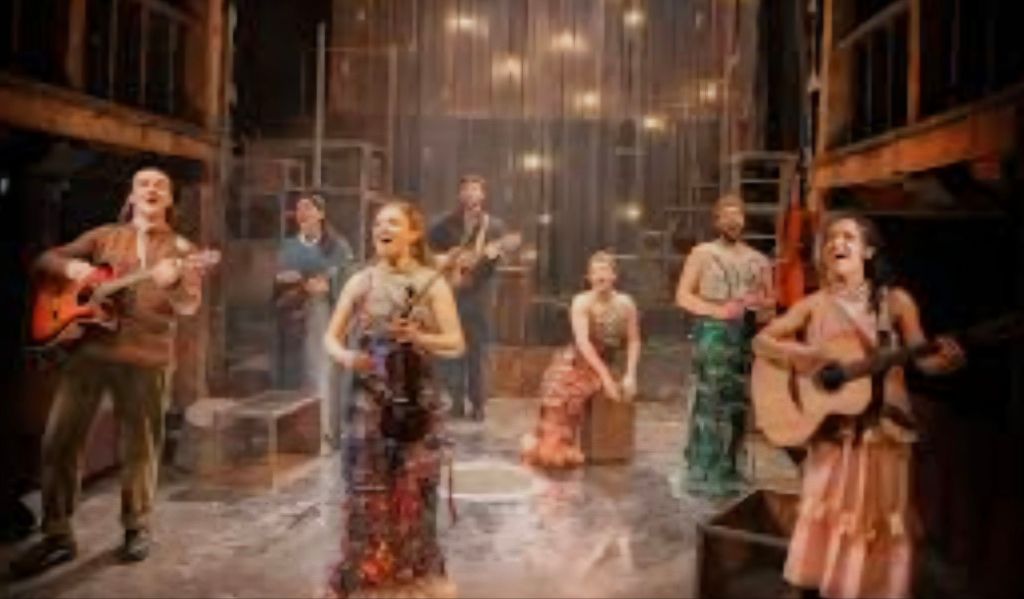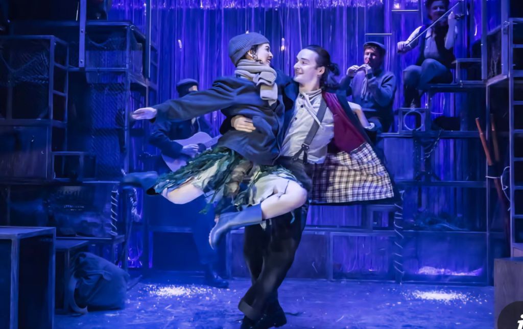 Set designer April Dalton uses the smaller stage at The Watermill to its full potential the water surface is the stage backdrop where the mermaids appear from leaving the rest of the staged area built up to predominantly represent the Cornish fishing port and when required the underwater kingdom.