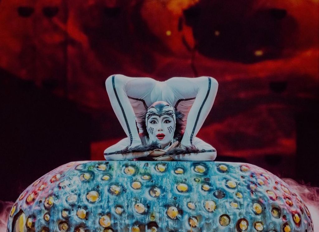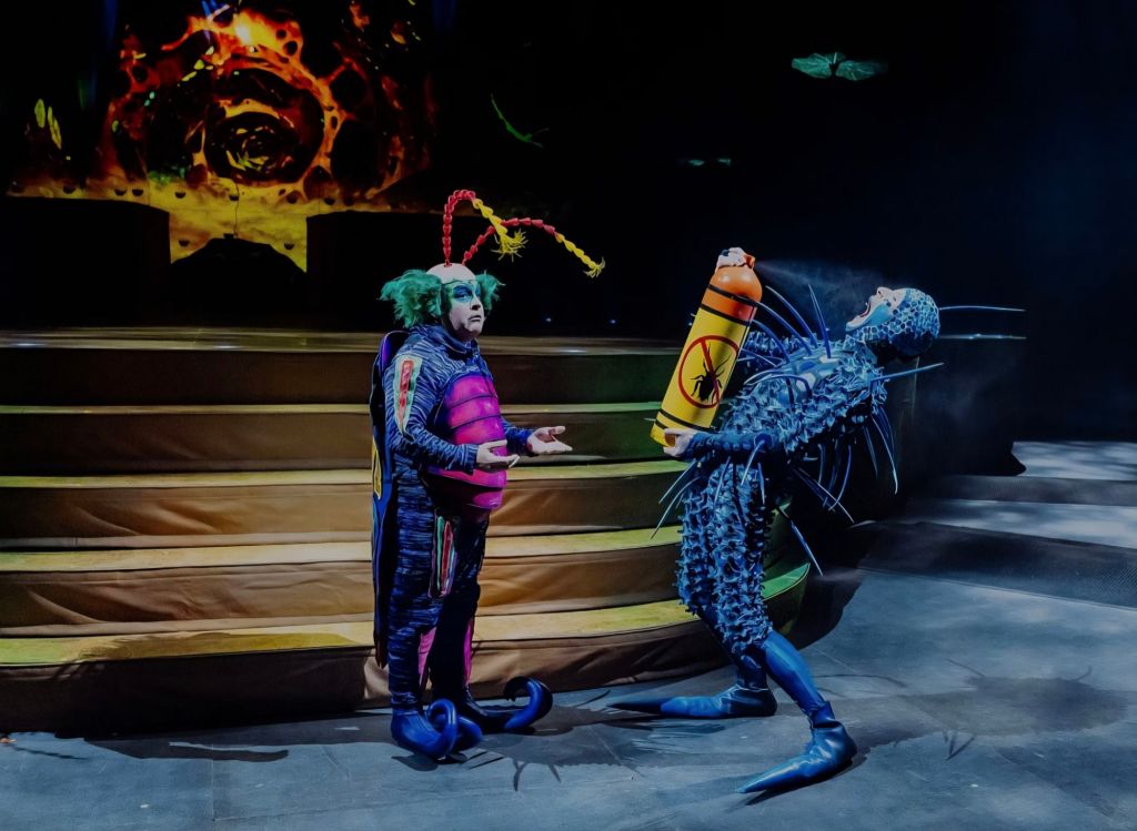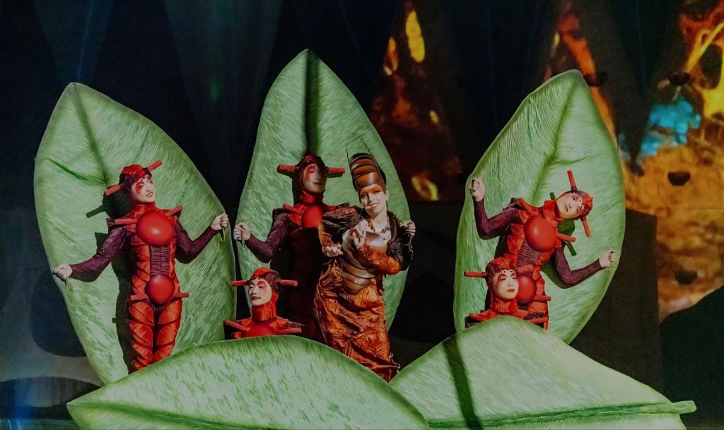Cirque du Soleil entertains the audience throughout the performance with a range of acrobatics. The insect world inspired production sees the bees in the flowers, worker red Ants gathering food in a line, a contortionist white spider and a group of grasshoppers.