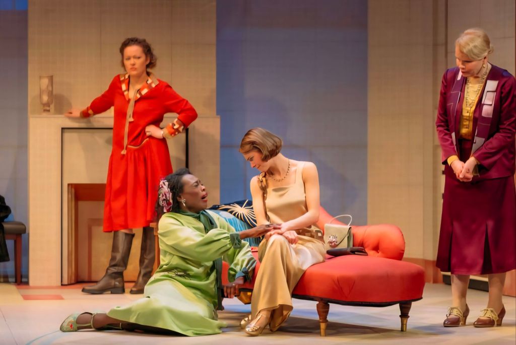 Philip Rham is a delight as Bentley, the piano‑playing butler whose dry mischief and impeccable timing lend the production a faint whiff of Wodehouse. Except for Bentley, the remaining male characters, John (Tim Delano), the philandering husband; Bernard Kersal (Jules Brown), the former lover; and Mortimer Durham (Sam Flint), Marie-Louise’s cuckolded spouse, are portrayed with little energy or complexity.