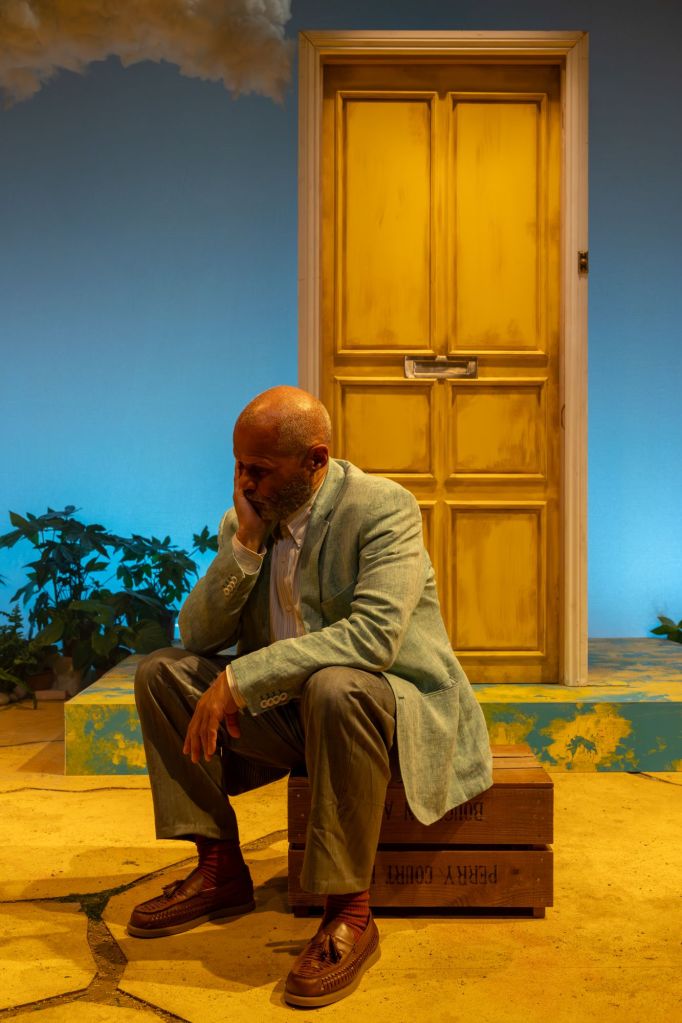 Hannah Danson’s set is bright and inviting with the bright yellow door and fluffy white clouds. An enticing sunny day setting is the perfect setting for somewhere for Mulberry to wait. Even though he hasn’t any idea what he is waiting for.
